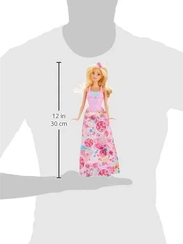 Prenses Barbie bebeğin üzerinde şeker detaylı pembe geçmeli bir korsaj, simli uzun renkli bir etek, uyumlu ayakkabılar ve bir prenses tacı var.