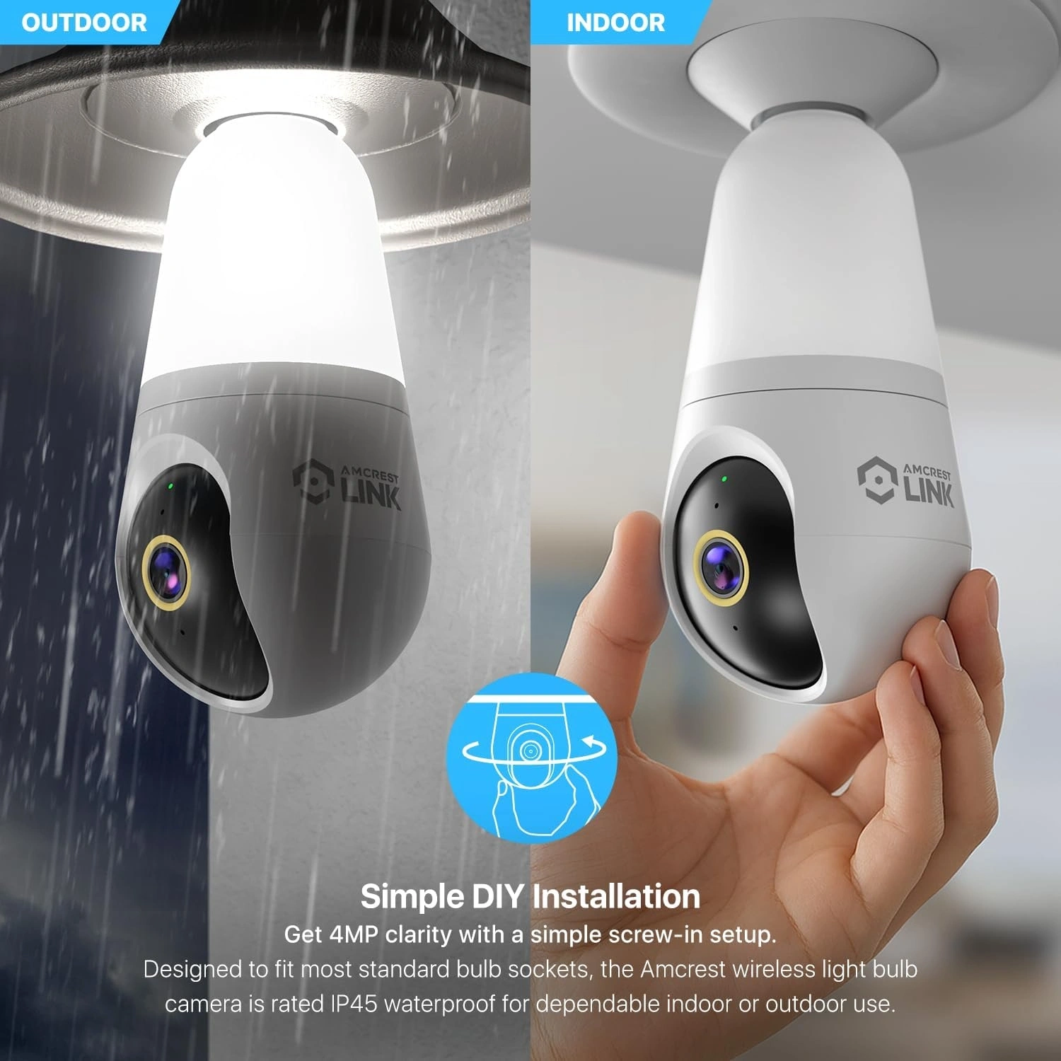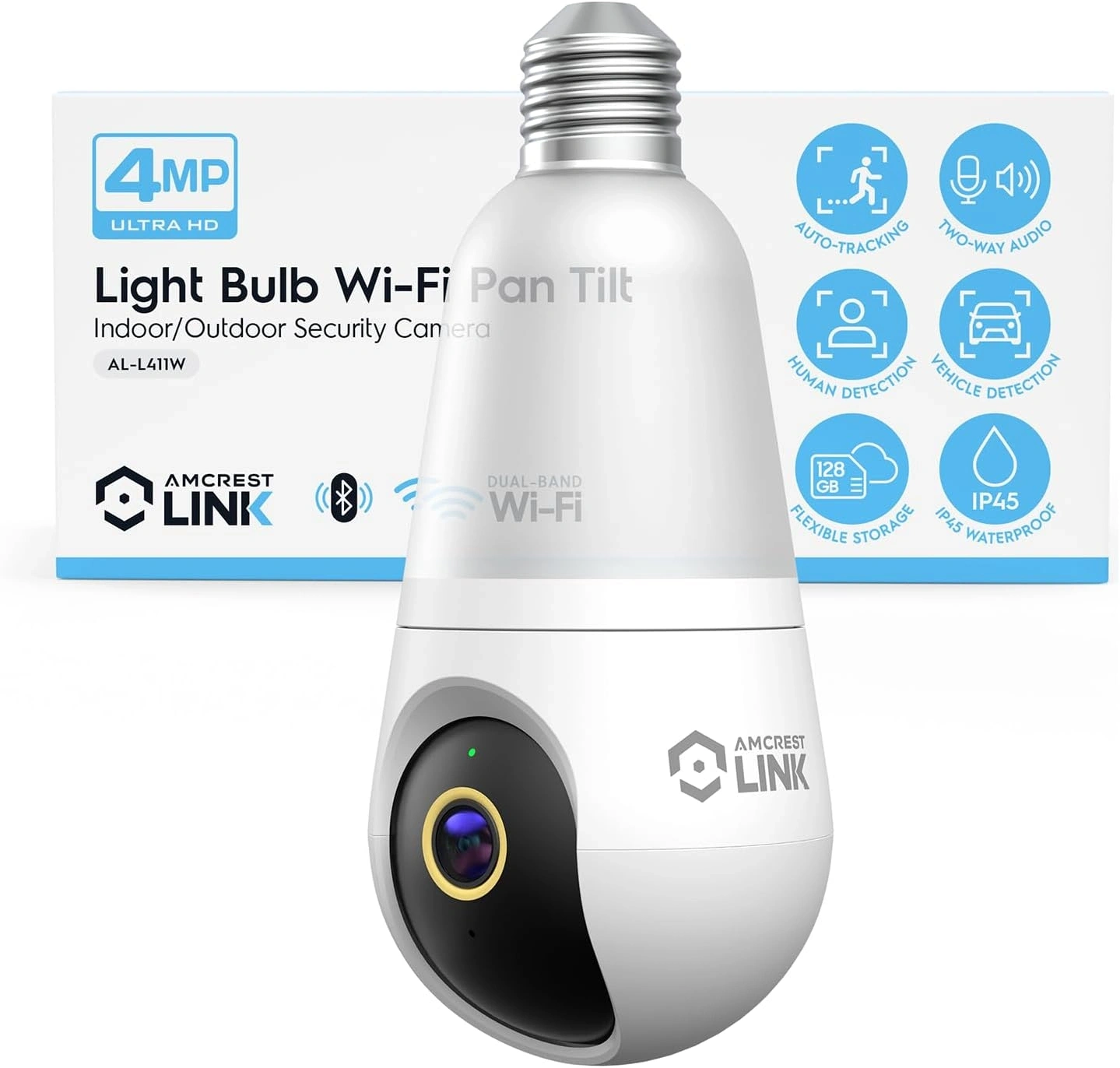 Amcrest Link 4MP Light Bulb WiFi Indoor/Outdoor Camera, Human Detection, 90.5° FOV, Pan/Tilt, IP45, AI Night Color, 2.4GHz/5GHz Dual Band Camera, Supports MicroSD Storage up 128GB, AL-L411W