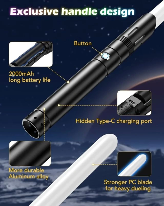 2'si 1 Arada Işın Kılıcı: 1. yerleşik konektör sayesinde, 2 ışın kılıcını 1 daha uzun ışın kılıcına bağlamak için ekstra bağlayıcı gerekmez. Işın kılıçlarından birinin kuyruğunu sökmeniz ve başka bir ışın kılıcını bağlamanız yeterlidir.