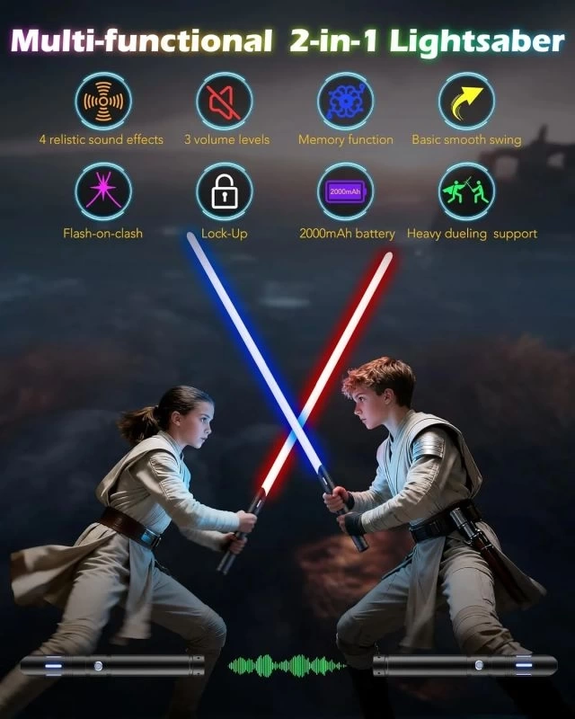Pürüzsüz Sallanan Işık kılıçları: En yeni sensörle donatılmış olan ışın kılıçları ses yansıtıcımız daha hassastır ve ses daha tutarlı ve duyarlıdır. Düello yaparken filmin ses efekti ve ışık flaşı, gerçek filme geçmenizi sağlar. Hassas yumuşak sallanma ve çarpışma, "gerçek" bir ışın kılıcı gibi ses çıkarır.