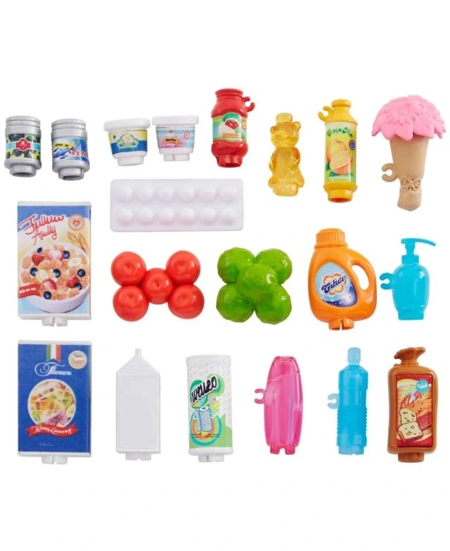 Barbie bebeğin alışveriş arabasını itmesine yardım edin, gerçekten yuvarlanıyor ve meyve ve sebze, yoğurt, bal ve ev ihtiyaçları gibi market ürünleriyle dolduruyor