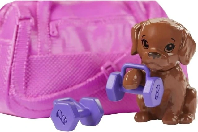 Barbie bebek, askılı yoga matı, hulahup, saat, su şişesi ve protein bar gibi parçalarla egzersiz yapmaya ve formda kalmaya hazır - ayrıca pembe spor çantasında bazı eşyaları taşıyabilir.
