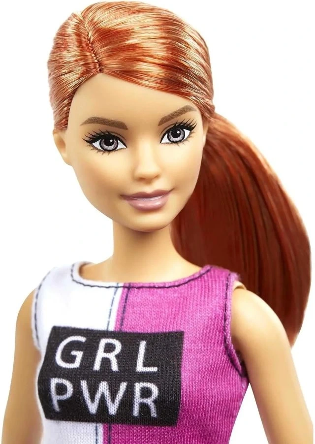 Barbie bebek, üzerinde "grl pwr" yazan renk bloklu bir üst, renkli spor pantolon ve beyaz spor ayakkabı giyiyor.