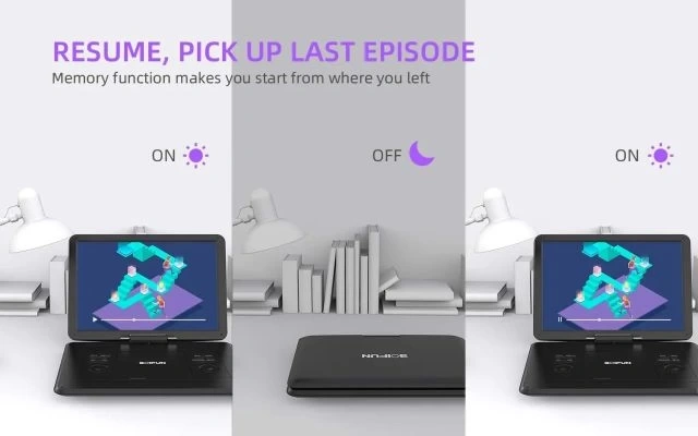 Şık Mor Tasarım -- Basit işletim sistemi ve geniş hacmi, bu taşınabilir DVD oynatıcıyı çocuklar ve yaşlılar için mükemmel kılar. Yoğun zamanlarınızda çocuklarınıza ve yaşlılarınıza refakatçilik sağlar. Buna ek olarak, bu taşınabilir DVD oynatıcı şık bir tasarıma sahiptir ve birinci sınıf taşınabilir DVD eğlencesinin keyfini çıkarmanızı sağlayan çarpıcı mor bir kaplamaya sahiptir.