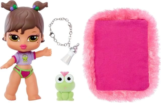 DAHİL: 1 Bratz Babyz bebeği, gerçek kıyafetler, biberon kolyesi/anahtarlığı, evcil hayvan, küpeler ve battaniye