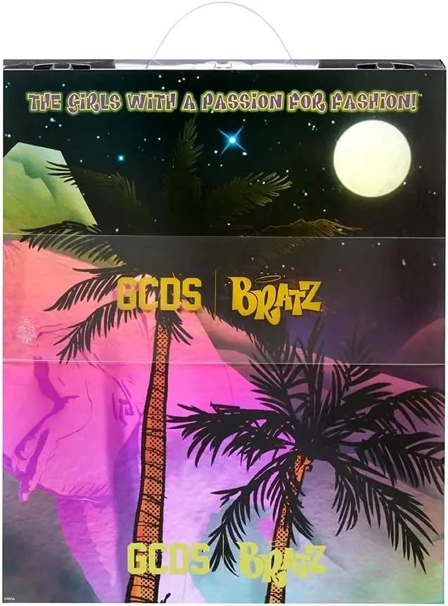 PRİMİUM PAKET: Geometrik yamuk şeklindeki kutu, folyo kaplamaya ve GCDS defilelerinden ikonik unsurların yer aldığı grafiklere sahiptir. Paketin kapakları açıldığında, iç kısımda tamamı folyo kaplı bir Bratz baskısı ortaya çıkar.