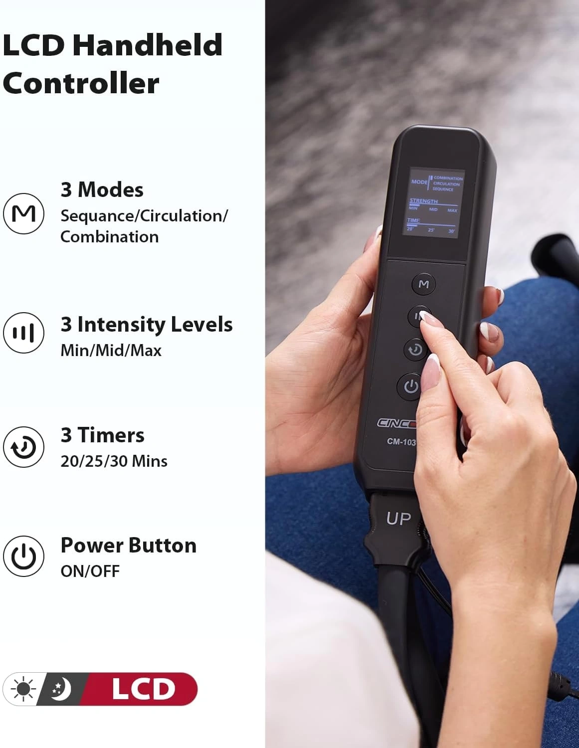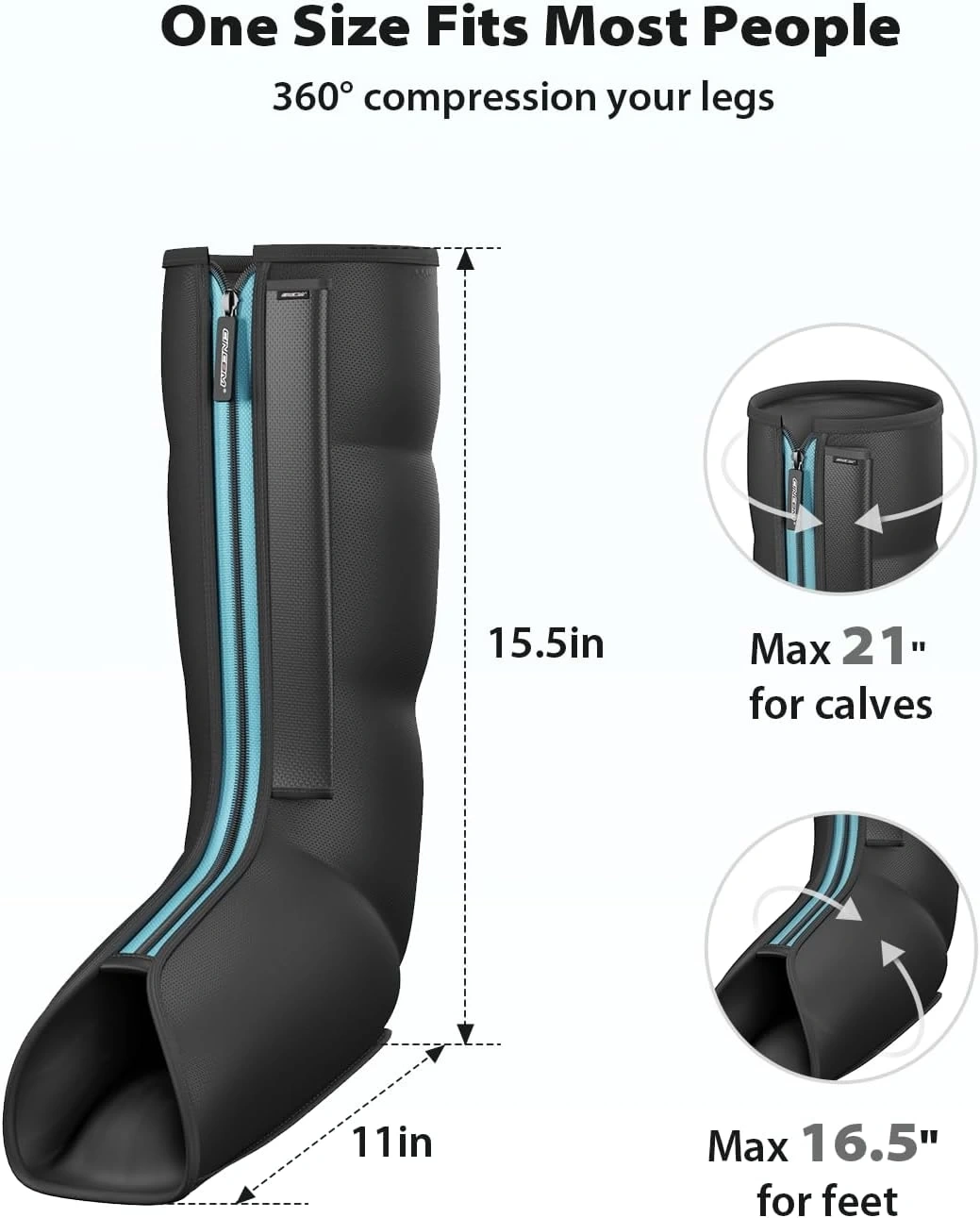Çoğu Bacağa Uygun - Gelişmiş basınç sensörü teknolojisine sahip CINCOM bacak kompresyon masaj aleti, farklı bacak boyutlarına sahip kişilerin eşit yoğunlukta masaj keyfi yaşamasını sağlar. Cihaz, 53 cm'ye kadar baldırlara ve 43 cm'ye kadar ayaklara uygundur.