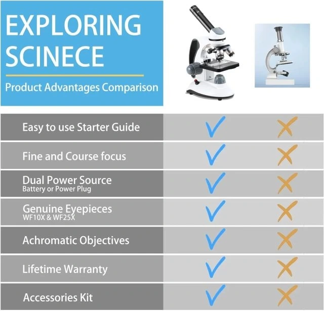 Çoklu Büyütme: WF10X ve WF25X mikroskop mercek tek başına veya 2X genişletici lensle, 4x 10x 40x akromatik objektif lenslerle birlikte çalışır, mikroskop 10 büyütme ayarı sunar: 40X,80X,100X,200X,250X,400X,500X,800X,1000X,2000X.