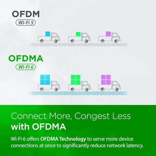 DAHA FAZLA CİHAZ BAĞLAYIN VE AĞINIZI GELECEĞE HAZIRLAYIN: Daha yüksek hızlarda daha fazla cihaz bağlayın. 11ac'den 4 kata kadar daha fazla kapasite, böylece daha fazla cihaz aynı anda bağlanabilir. Cihaz yoğunluğu olan ortamlarda daha iyi performans. 8'e kadar eş zamanlı akış, daha az gecikmeyle daha fazla cihaza veri iletir.