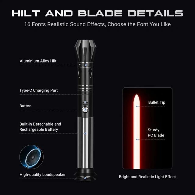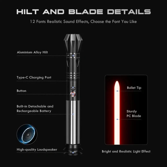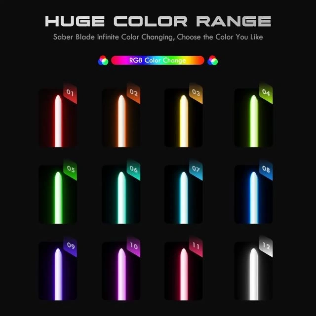 Ses Efektleri ve Işık Efektleri: 12 ses yazı tipi efekti; 3 ışık efekti (Sabit, Darbe, Kararsız); 3 ses ayarı bulunur. (Yüksek, Düşük, Sessiz). Işın kılıcı kılıcın gerçek bir lazer sesi vardır. Ayrıca süper hassas ve daha parlak bi üründür. RGB hafif düello kılıcı, canlı ve gerçekçi bir savaş deneyimi sunmak için özel savaş ses efektlerini ve flaş modlarını birleştirir.
