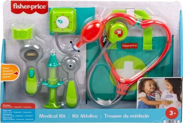 Steteskop, tansiyon manşonu, termometre, otoskop, şırınga, bandaj ve kumaş 'doktor' çantası dahil 7 tıbbi alet oyun parçasından oluşan doktor taklidi oyun seti