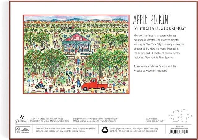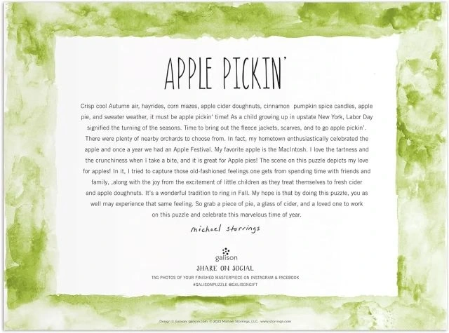 1.000 PARÇA PUZZLE: Galison'dan Elma Toplama adlı 1000 Parçalı puzzle, birkaç günlük şaşırtıcı eğlence için doğru düzeyde bir meydan okumadır. Kutu ayrıca referans için sanatçı ve resim hakkında bir ek içerir.