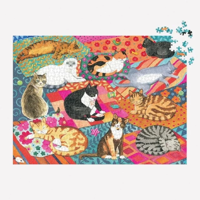 MUHTEŞEM DETAYLAR: Bu parlak ve renkli puzzle, el yapımı kumaşlar ve ev bitkileriyle dolu bir cennette yan yana yuvalanmış iki sevimli kedinin yer aldığı bir rahatlık resmidir.