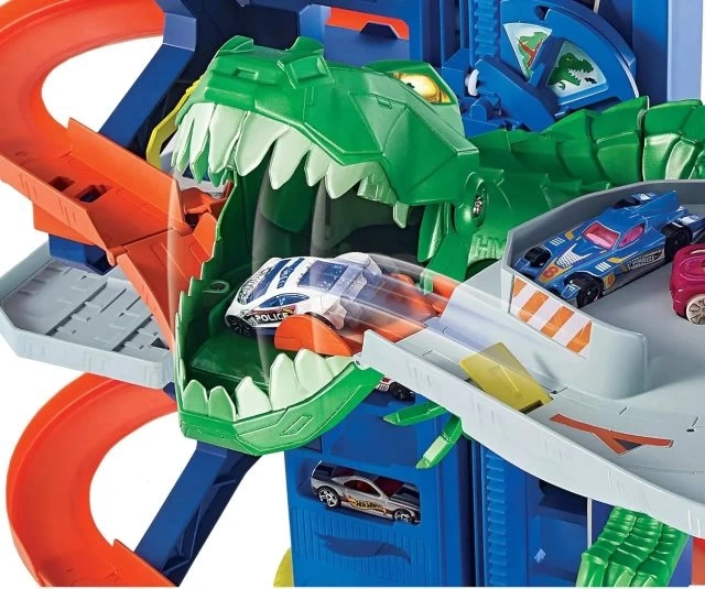 Bazı leziz Hot Wheels araçlarını yutmak isteyen aç Robo T-Rex'e dikkat edin. Bu Garaj, normal 1:64 ölçekli spor arabalarla veya sedanlarla en iyi şekilde çalışır. Minibüsler, kamyonlar veya otobüsler gibi hacimli veya çok ağır arabalar da çalışmaz.