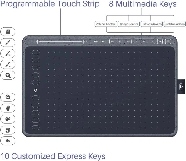 10 Programlanabilir Basma Tuşu ve Dokunmatik Şerit - 10 programlanabilir basma tuşu, HUION sürücüsünde ve HUION çizim uygulamasında özelleştirilebilir. Eklenen programlanabilir dokunmatik şerit tuvalinizi kolayca yakınlaştırabilir veya uzaklaştırabilir. C Tipi fiş, daha rahat ve sağlam olan her iki yönde de kolayca takılıp çıkarılabilir.