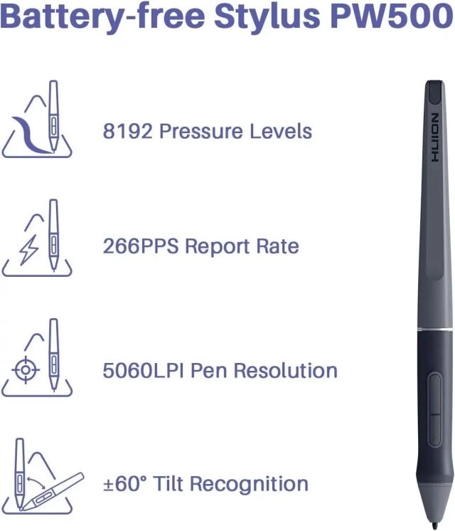 Pilsiz Kalem - 266PPS rapor hızına ve 8192 basınç hassasiyet seviyesine sahip PW500 pilsiz dijital kalem, size doğa ve pürüzsüz çizgiler sağlar. ±60° eğim desteği gerçek fırça darbelerini taklit ederek size daha gerçekçi bir çizim deneyimi sunar.