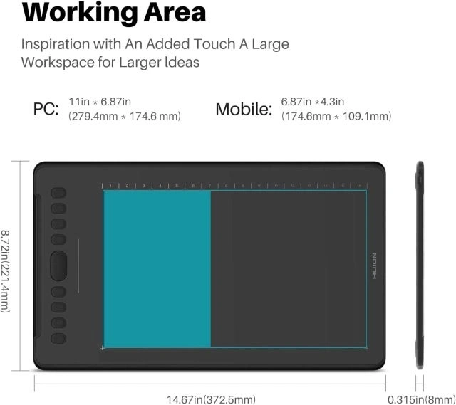 Çalışma Alanı Yapılandırması - HUION art tablet, kullanıcıya çalışmak için en rahat boyutu sağlayan 10 x 6,25 inçlik bir çalışma alanıyla donatılmıştır; 10 mm'lik ince yapı ve minimalist görünüm tasarımı, çizim tabletini daha çekici hale getiriyor.