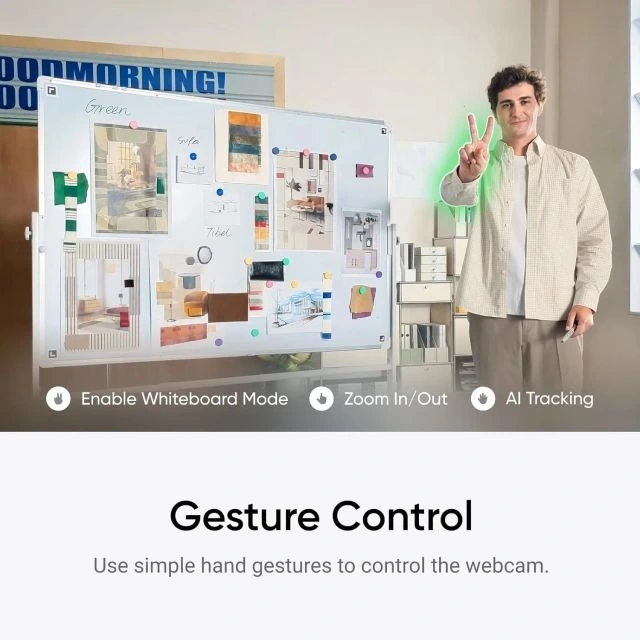 • Hareket ve Uzaktan Akıllı Telefon Kontrolü: Web kameranızı akıllı telefonunuzdan uzaktan kontrol edin veya kullanın. Basit el hareketleriyle yapay zeka takibi/otomatik çerçevelemeyi başlatın, yakınlaştırın veya uzaklaştırın ve Beyaz Tahta Modunu etkinleştirin.