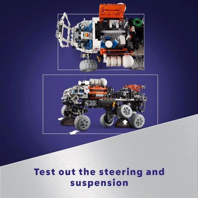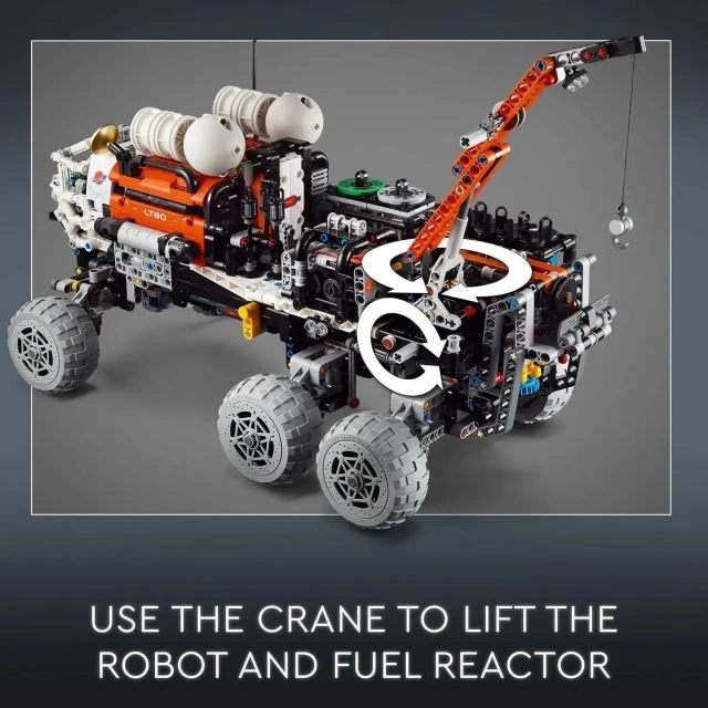 Özelliklerle dolu bir uzay oyuncağı – Bu uzay yapım oyuncağı, genişleyen bir kamyon yatağı, süspansiyon, hareketli bir vinç, asansör, jeneratör, işaret lambaları, yardımcı gezici, yaşam alanları ve kokpit içerir