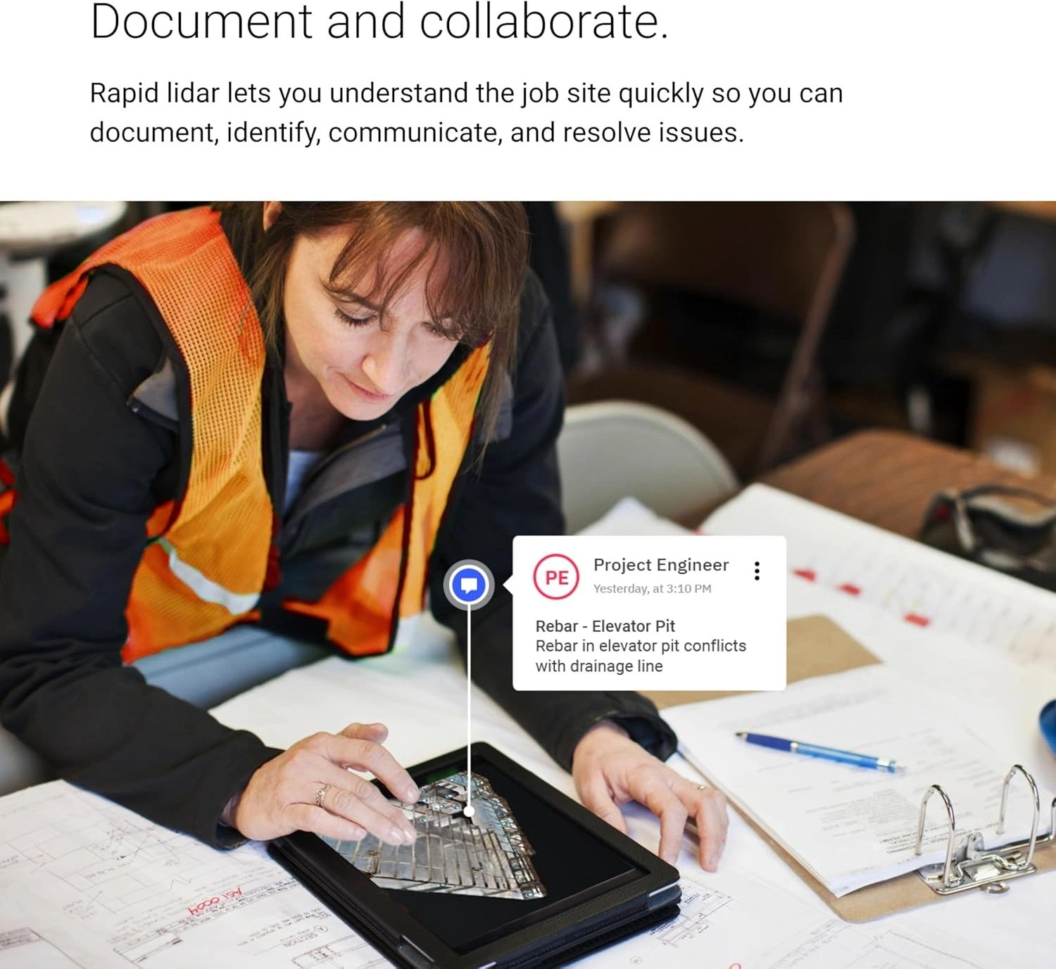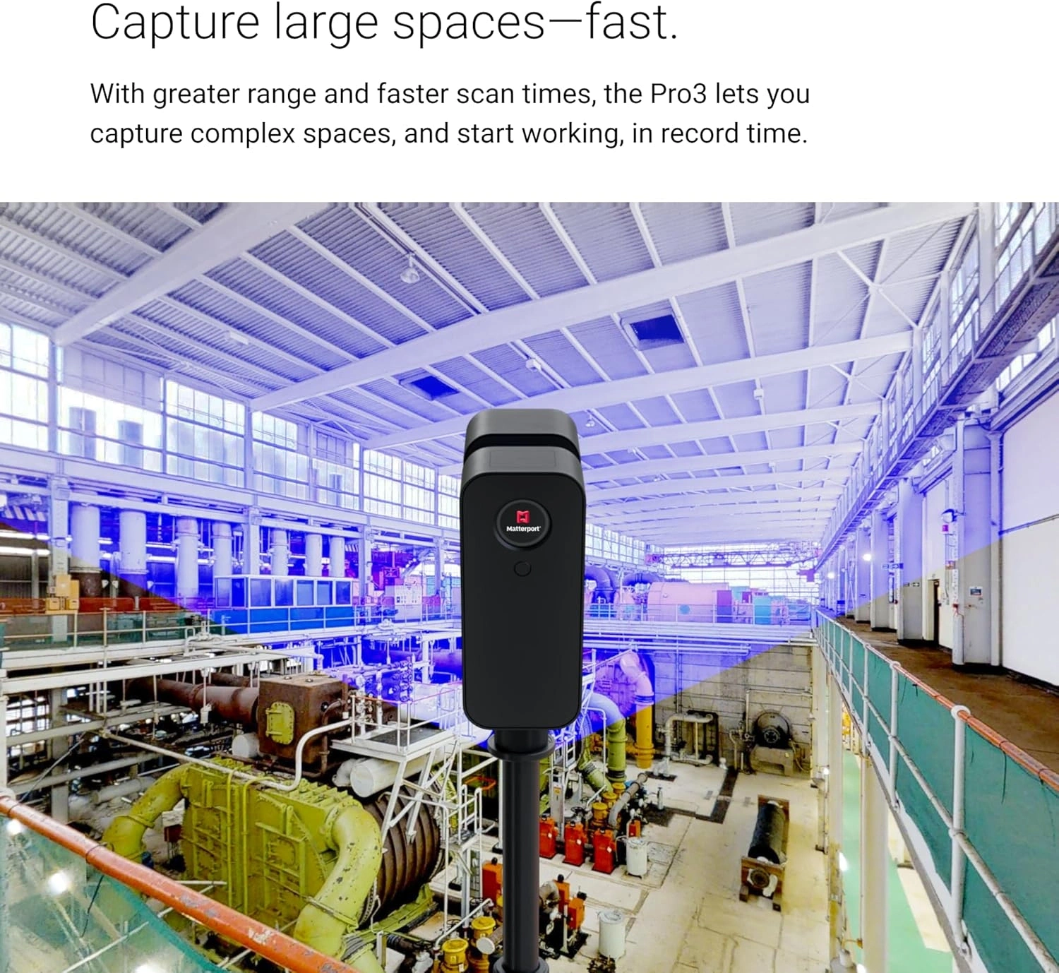 Ultra hızlı yüksek hassasiyetli lidar sensörü - Pro3 lidar sensörü, en karmaşık odaların bile hızlı ve doğru bir şekilde yakalanabilmesini sağlamak için tarama başına milyonlarca ölçüm yapar. Yüksek hassasiyet (+/- 20 mm @10 m) ile büyük projeler inanılmaz detay ve doğrulukla (saniyede 100.000 nokta) işlenebilir.