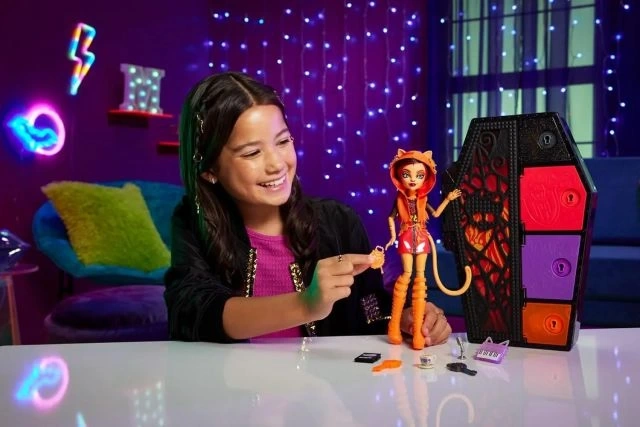 Toralei Stripe bebeği cesur renkli saçları ve makyajıyla kendini ifade ediyor. Kolay saklama ve hareket halindeyken taşınabilirlik için onu ve tüm Neon Korkularını tabut şeklindeki dolabın içine koyun.