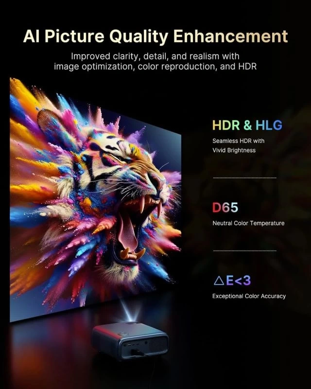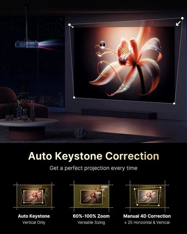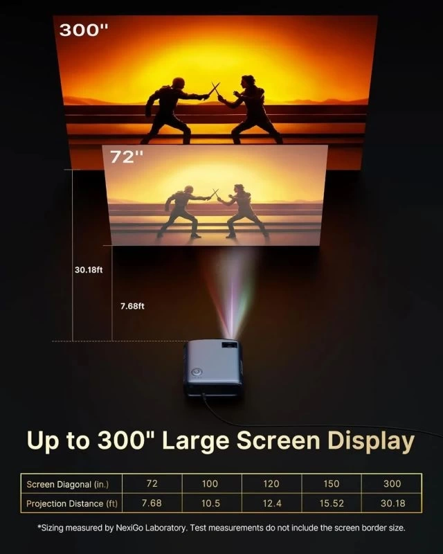 Devasa Ekran: NexiGo PJ40 Ultra, etkileyici 300 inç ekrana kadar yansıtır. Yakınlaştırma işlevi sayesinde projektörü hareket ettirmeden ekranı %60'a kadar kolayca küçültebilirsiniz. Otomatik dikey trapezoid düzeltme özelliğiyle her seferinde mükemmel seviyede bir projeksiyonun keyfini çıkarabilirsiniz. Sinema salonlarıyla yarışacak kadar büyük bir ekranla film gecelerinizi dönüştürün.