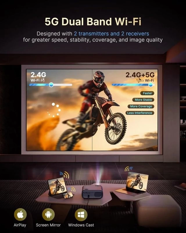 Kusursuz Bağlantı: 5 GHz Wi-Fi üzerinden iOS, Android ve Windows cihazlar için kablosuz ekran yansıtma özelliğini destekler ve ekstra adaptör veya uygulama gerektirmeden kolay görüntüleme sağlar. (Not: Netflix, Amazon Prime ve Hulu gibi yayın uygulamaları telif hakkı kısıtlamaları nedeniyle yansıtmayı desteklemeyebilir.) PJ40 Ultra ayrıca tüm cihazlarınızı, oyun konsollarınızı, ses sistemlerinizi ve daha fazlasını bağlamak için 2 USB bağlantı noktası, 2 HDMI girişi, bir AV bağlantı noktası ve 3,5 mm ses jakı içerir!