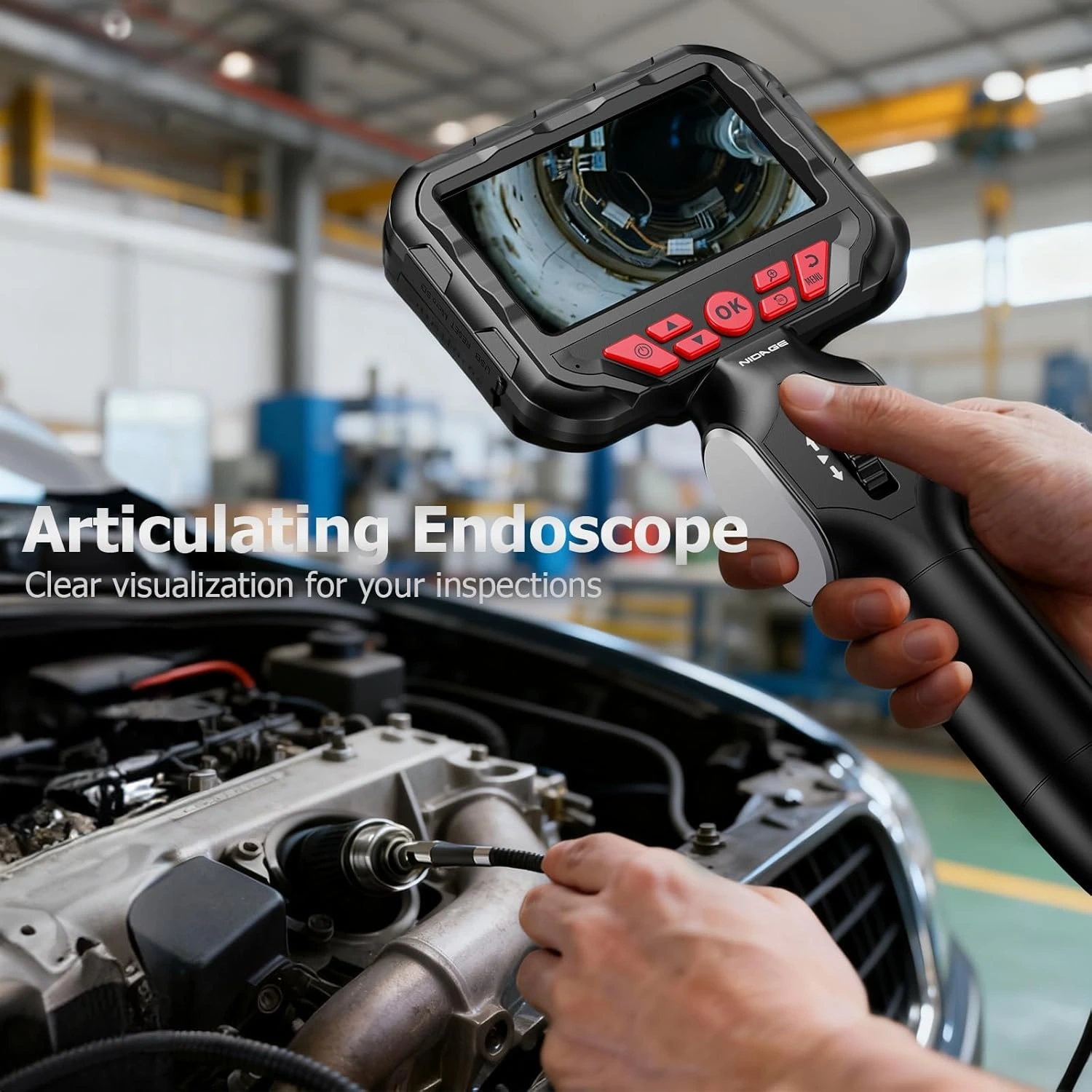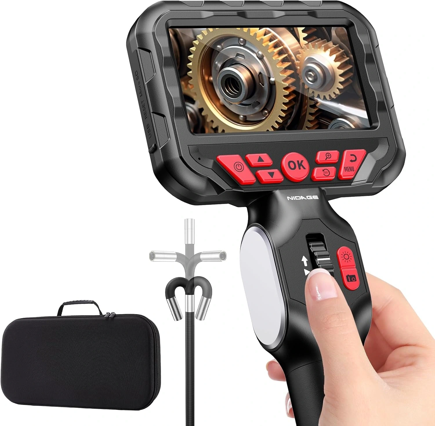 NIDAGE 2-Way Articulating Borescope 5.5mm Industrial Endoscope with Articulated Probe Flexible Video Inspection Camera with Light, Snake Scope Cam for Automotive Aircraft Mechanics, 4.3FT