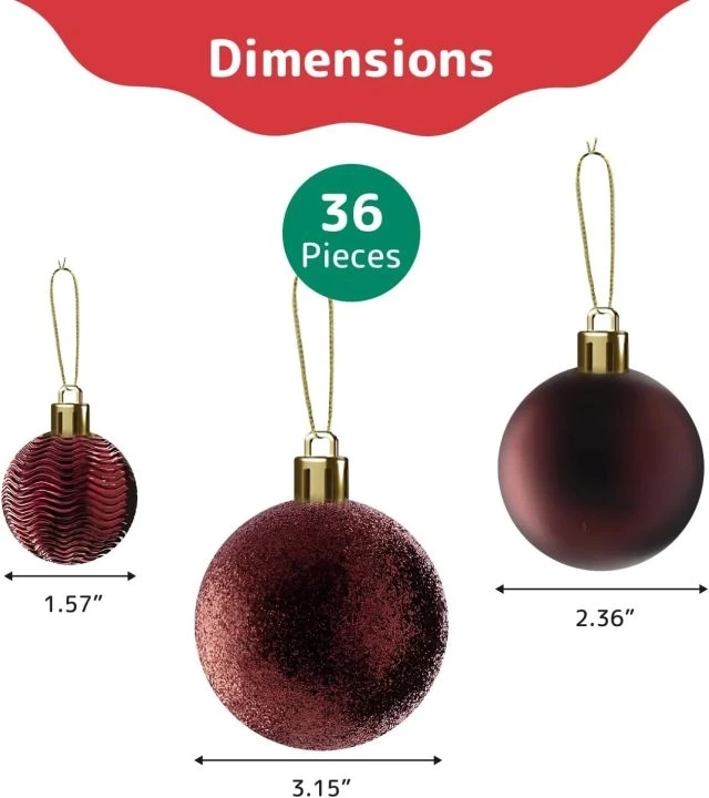 Süs Seti İçeriği: 18 Küçük Top (1,57", 40mm), 12 orta boy top (2,36", 60mm) ve 6 büyük top (3,15", 80mm), ağacınızı, çelenkinizi, süs eşyalarınızı ve daha fazlasını doldurmanıza olanak tanır.