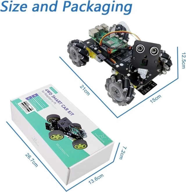 • Raspberry pi'yi temel alan bu arabanın birden fazla Işlevi var. (montaj gereklidir. Raspberry pi ve pil dahil değildir.)