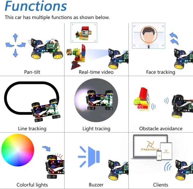 Raspberry pi'yi temel alan bu arabanın birden fazla Işlevi var. (montaj gereklidir. Raspberry pi ve pil dahil değildir.)