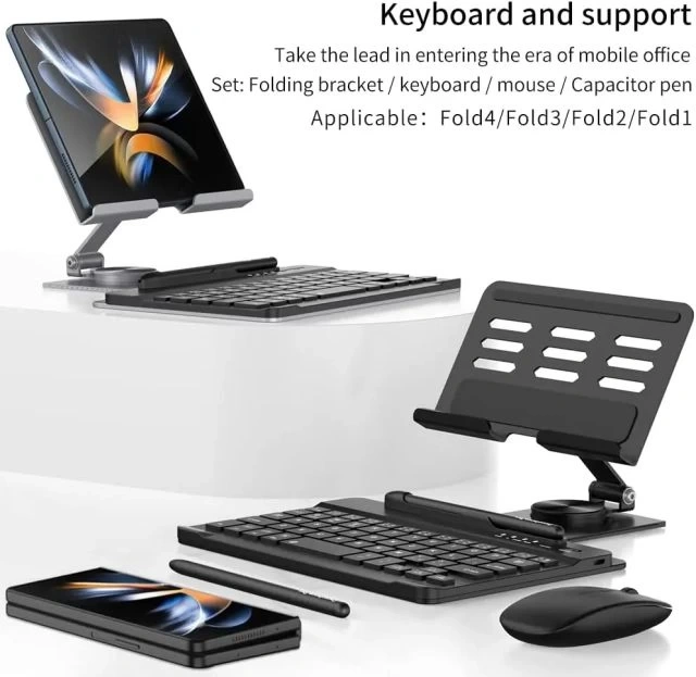 Mobil ofis çağına girmede liderliği ele alın. Set: Katlanır Braket/Klavye/Fare/Kapasitör Kalemi. Uyumluluk :Samsung Galaxy Z Fold 4 5G (2022),Samsung Galaxy Z Fold 3 5G (2021),Samsung Galaxy Z Fold 2 (2020),Samsung Galaxy Z Fold (2019) ile uyumludur.(S Pen dahil değildir).