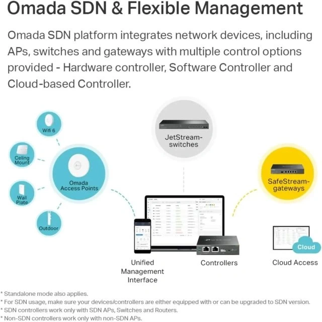 • Omada SDN'ye entegre: Omada Yazılım Tanımlı Ağ İletişimi (SDN) platformu, erişim noktaları, anahtarlar ve ağ geçitleri dahil olmak üzere ağ cihazlarını birden fazla kontrol seçeneğiyle entegre eder - Omada Donanım denetleyicisi, Yazılım Denetleyicisi veya Bulut tabanlı denetleyici*(Bulut Tabanlı için TP-Link ile iletişime geçin) Denetleyici Ayrıntıları). Bağımsız mod da geçerlidir.