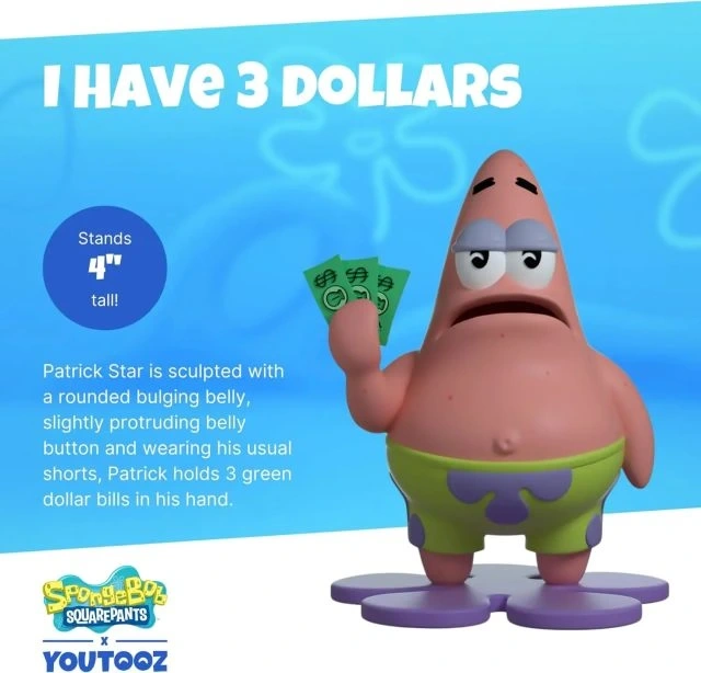 Youtooz Sünger Bob Koleksiyonu: Youtooz Patrick Star figürü, Bikini Bottom'dan itibaren Youtooz evrenine katılıyor. Yuvarlatılmış şişkin bir göbeğe, hafifçe çıkıntılı bir göbek deliğine sahip olan ve her zamanki şortunu giyen bu Youtooz Patrick vinil figürü, elinde 3 adet yeşil dolar banknotu tutuyor. Bu sahne, insanların belirli durumlarda parasızlıklarını ifade etmelerini sağlayan bir internet meme'i haline geldi.